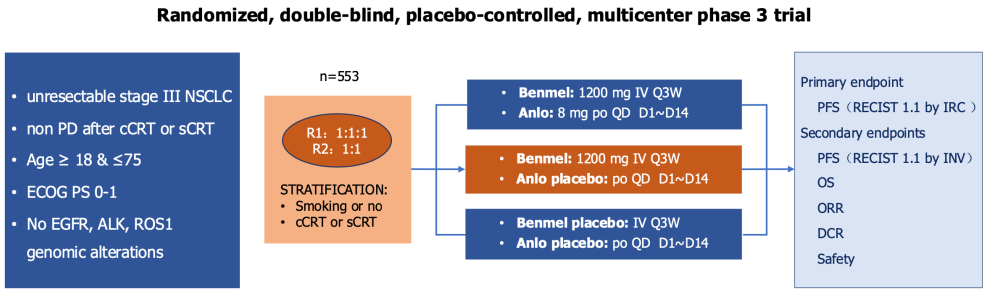Ⅲ期R-ALPS研究(NCT04325763)将553例局部晚期、不可切除的Ⅲ期NSCLC患者(在同步/序贯放化疗[60 Gy±10%]后未发生疾病进展),随机分配至三个组:1)贝莫苏拜单抗(1 200 mg,iv,q3w)联合安罗替尼(8 mg,po,d1-d14,q3w);2)贝莫苏拜单抗单药治疗;3)安慰剂组。样本量分配:第一阶段1:1:1,第二阶段1:1。分层因素包括:吸烟史(是/否);前序治疗方式(序贯/同步)。主要终点:独立影像评估委员会(IRC)评估的无进展生存期(PFS,基于RECIST 1.1标准)。
