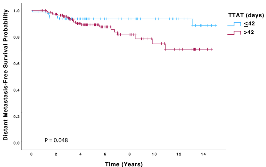 这是一项来自爱尔兰的单中心回顾性研究,分析了手术治疗后接受曲妥珠单抗辅助治疗且未接受过新辅助治疗的HER2阳性乳腺癌患者。患者根据术后至曲妥珠单抗辅助治疗时间(TTAT),分为TTAT≤42天或TTAT>42天两组。TTAT定义为HER2阳性浸润性乳腺癌初次手术至开始曲妥珠单抗辅助治疗的时间间隔。关键终点包括总生存(OS)、无病生存(DFS)和无远处转移生存(DMFS),通过Kaplan-Meier和Cox回归分析进行评估。