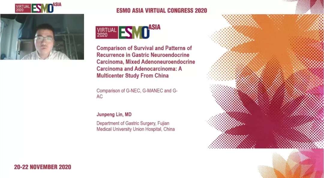 2. J.-P. Lin, G.-J. Lin, Z.-K. Wang, et al. Comparison of survival and patterns of recurrence in gastric neuroendocrine carcinoma, mixed adenoneuroendocrine carcinoma and adenocarcinoma: A multicenter study from China. ESMO Asia Virtual Congress 2020 (20-22 November 2020). Abstract 117MO.