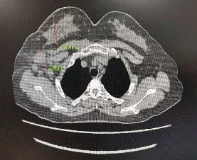 CT:提示右侧乳房未见明显的肿块,右侧腋窝淋巴结明显肿大;
