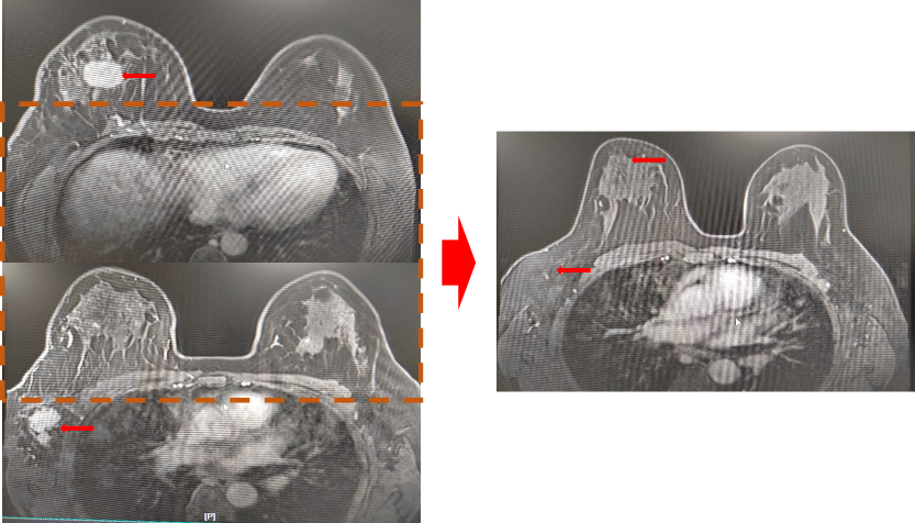 该患者分别于2021-10-15、2021-11-5、2021-12-1、2021-12-22、2022-1-13、2022-2-8完成6周期新辅助化疗,方案:TCbHP,紫杉醇脂质体210mg+卡铂 0.6g+汉曲优(首次剂量 500mg,维持剂量380mg)+帕妥珠单抗(首次剂量 840mg,维持剂量420mg),该患者在完成第一周期新辅助化疗后,自觉肿块明显缩小,在行第3周期新辅助化疗入院后,予以完善乳腺MRI提示,乳腺肿物及腋窝淋巴结均明显缩小,查体几乎无法触及乳腺肿物及腋窝肿大淋巴结,继续完成6周期足量新辅助化疗后行乳腺癌改良根治术。