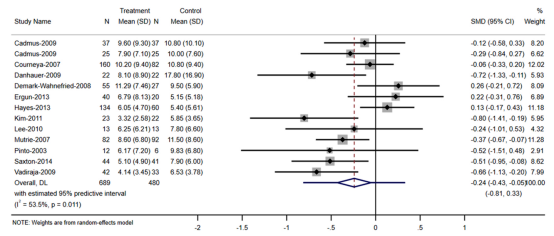 为了评估诊断后锻炼对乳腺癌幸存者抑郁的影响,研究人员纳入了13项研究中689名干预组参与者和480名对照组参与者的数据。在干预期结束时结果显示,与对照组相比诊断后锻炼具有统计学意义(SMD=0.24,95%CI:0.43~0.05,P=0.012),具有中度统计异质性(P=0.011,I2 = 54%)(图2)。