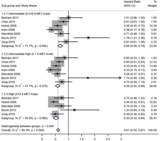 前瞻性观察研究检查了诊断后锻炼对乳腺癌幸存者死亡率的影响,通过使用不同的分界点,根据身体活动水平对患者进行分组(即诊断后锻炼对乳腺癌幸存者死亡率的影响)。由于各研究的分类不一致,meta分析中使用了以下体育活动水平:低水平体育活动,0~≤3 MET-h/周;中等水平的体育活动,2.5~<8.9 MET-h/周;中级至高级体力活动,≥7.5 MET-h/周;高强度体力活动,≥14.9 MET-h/周(图4)。